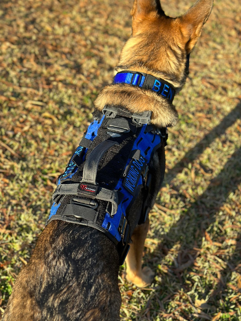 The Harness allows for Full range of motion, by not restricting the K9's shoulder movement, like most harnesses/vests on the market today. This is evident in our Patented "V" shape Padded chest plate design.